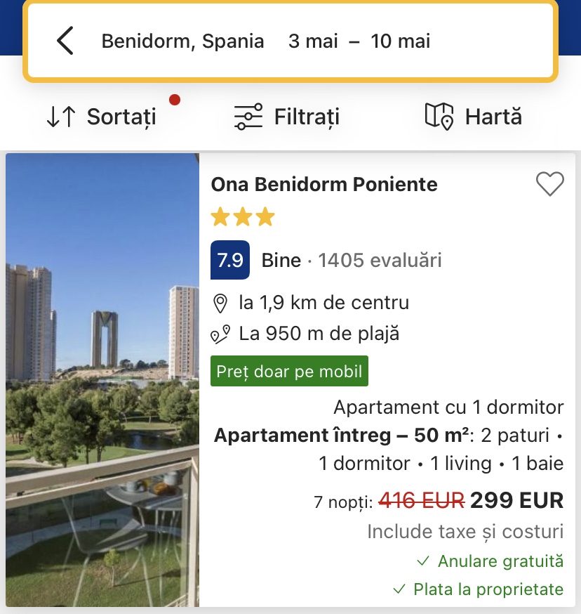 - cazare opt. 1: Ona Benidorm Poniente, 299 euro/apartament, 149.5 euro/pers