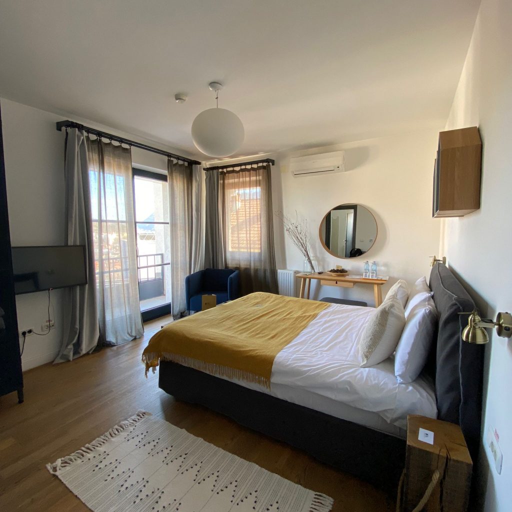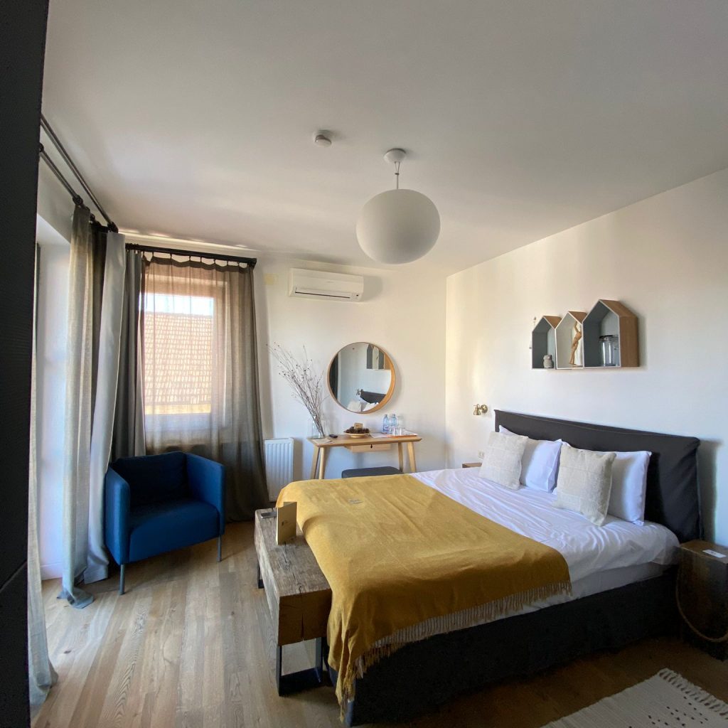 Hotelul dispune de 6 spatii generoase, 2 apartamente si 4 camere duble. Noi, am avut o camera dubla cu o vedere panoramica superba spre Brasov. Patul foarte mare si comod, iar ce ne-a impresionat cel mai mult a fost ca desi eram intr-unul dintre cele mai mari orase din Romania, nu a fost deloc galagie si am avut un somn foarte odihnitor. Una dintre camerele duble dispune atat de cabina de dus, cat si de cada, un aspect nemaintalnit de noi.