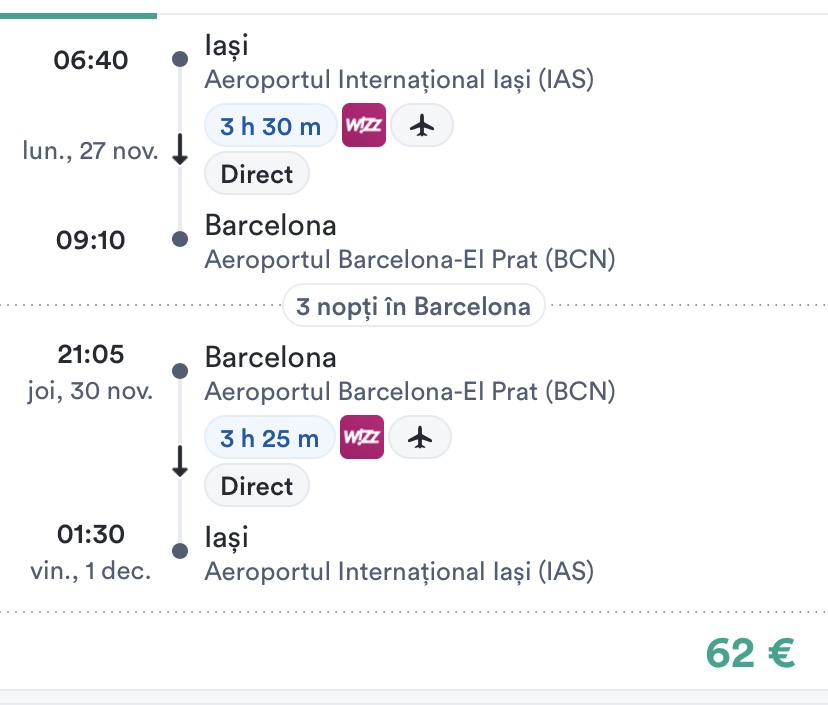 - zbor: Iasi – Barcelona, 62 euro/pers, dus-intors, toate taxele incluse+bagaj de mana mic