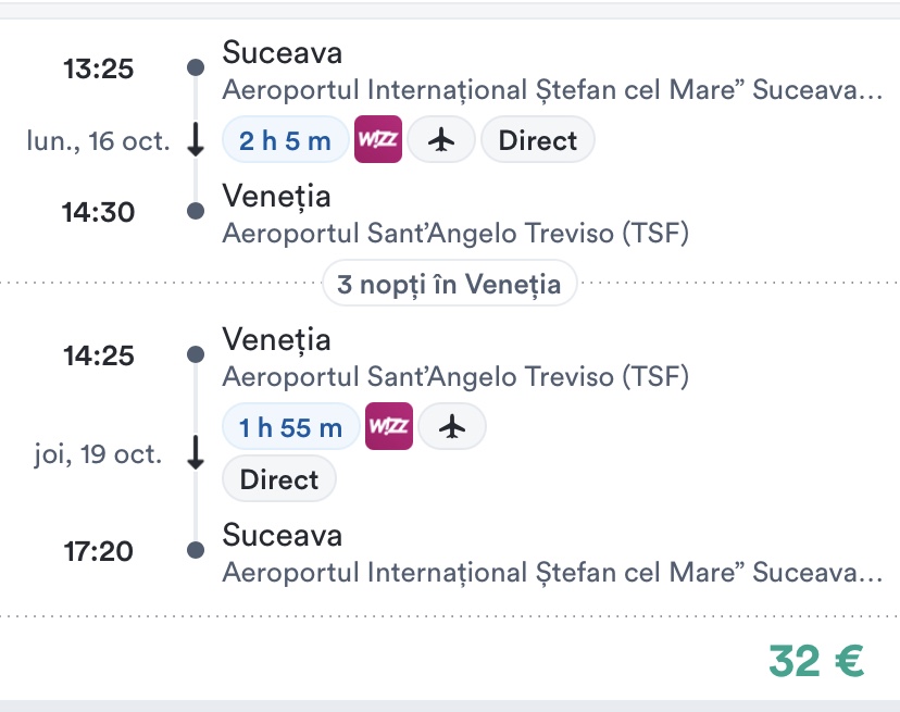 - zbor: Suceava – Venetia, 32 euro/pers, dus-intors, toate taxele incluse+bagaj de mana mic