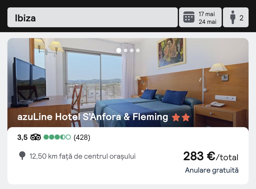 - zbor: Craiova – Ibiza, 87 euro/pers, dus-intors, toate taxele incluse+bagaj de mana mic