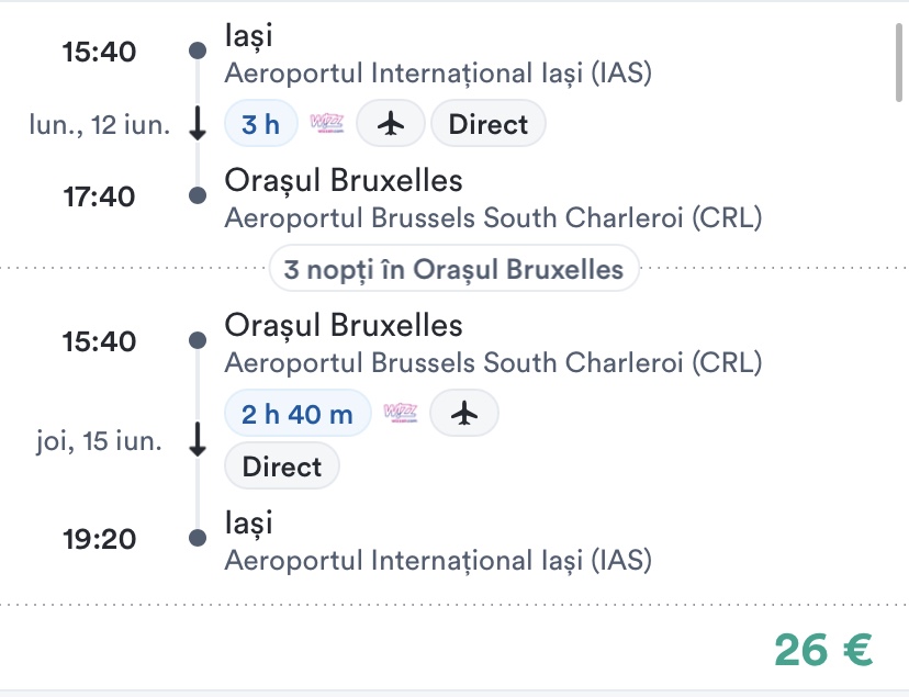 - zbor: Iasi – Bruxelles, 26 euro/pers, dus-intors, toate taxele incluse+bagaj de mana mic