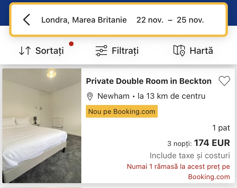 - cazare opt. 1: Private Double Room in Beckton, 174 euro/camera dubla, 87 euro/pers