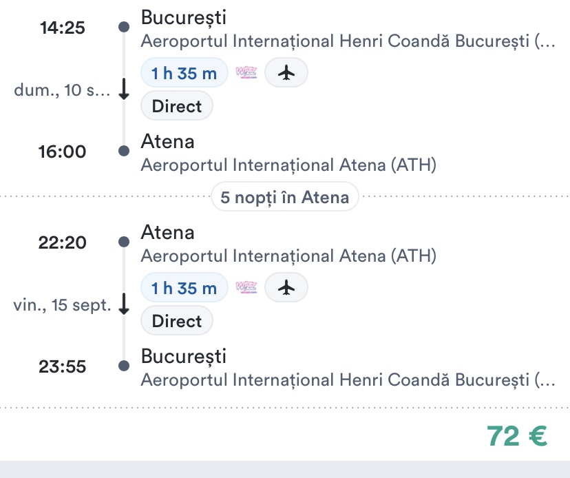 - zbor: Bucuresti – Atena, 72 euro/pers, dus-intors, toate taxele incluse+bagaj de mana mic
