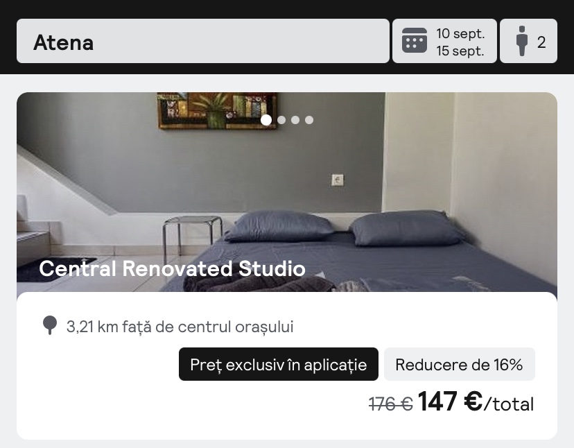 - cazare opt. 1: Central Renovated Studio, 147 euro/apartament, 73.5 euro/pers
