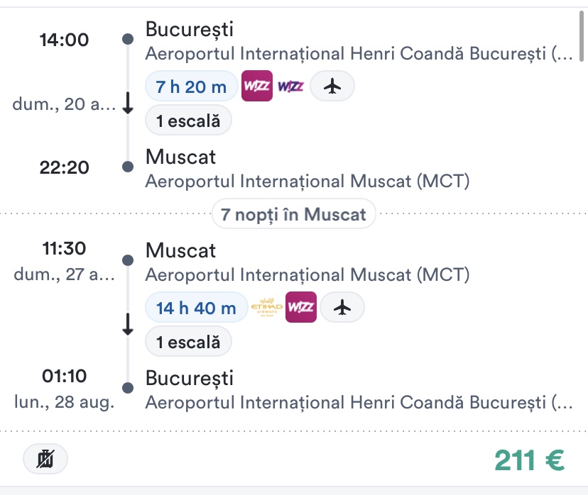 - zbor: Bucuresti – Muscat, 211 euro/pers, dus-intors, toate taxele incluse+bagaj de mana mic