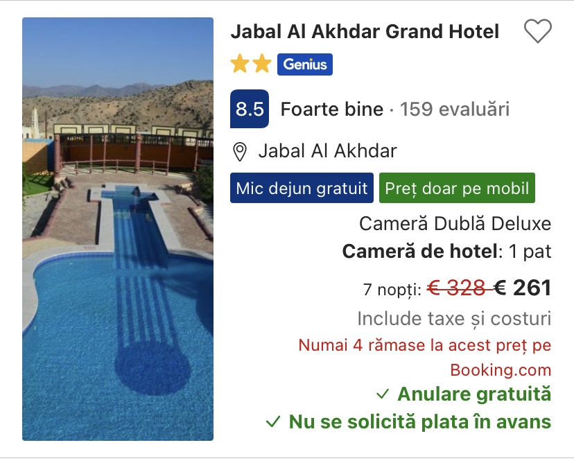 - cazare opt. 1: Jabal Al Alkhdar Grand Hotel, 261 euro/camera dubla, 130.5 euro/pers, mic dejun inclus