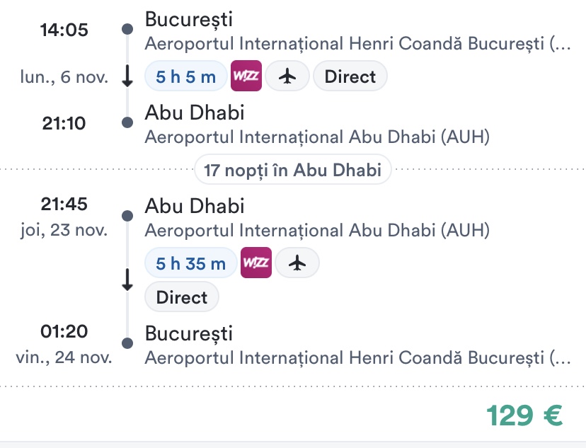 - zbor Bucuresti – Abu Dhabi, 129 euro/pers, dus-intors, toate taxele incluse
