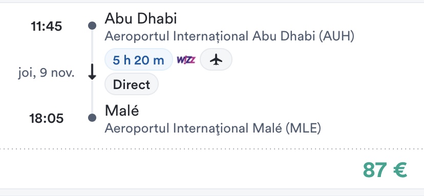 - zbor Abu Dhabi – Male, 9 noiembrie, 87 euro/pers, dus, toate taxele incluse