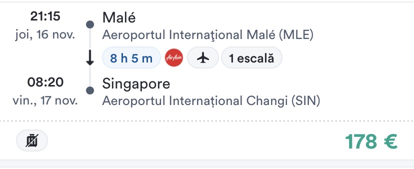 - zbor Male – Singapore, 16 noiembrie, 178 euro/pers, dus, toate taxele incluse