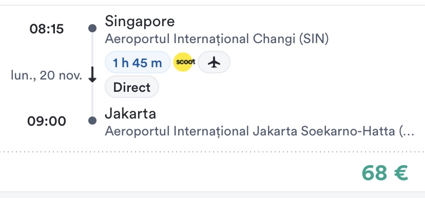 - zbor Singapore – Jakarta, 20 noiembrie, 68 euro/pers, dus, toate taxele incluse