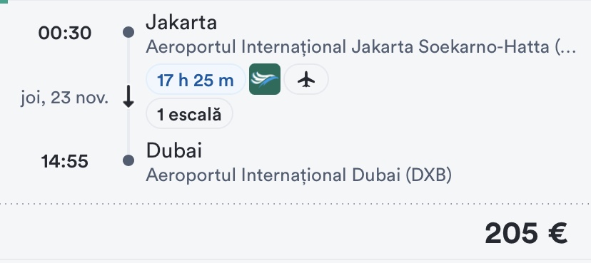 - zbor Jakarta – Dubai, 23 noiembrie, 205 euro/pers, dus, toate taxele incluse