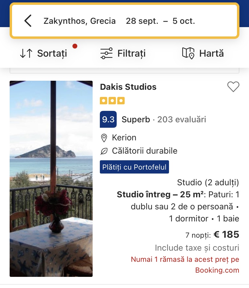 - cazare opt. 1: Dakis Studios, 185 euro/apartament, 92.5 euro/pers