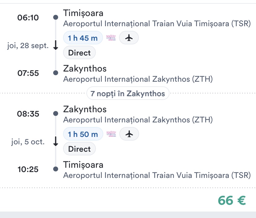 - zbor: Timisoara – Zakyntos, 66 euro/pers, dus-intors, toate taxele incluse+bagaj de mana mic