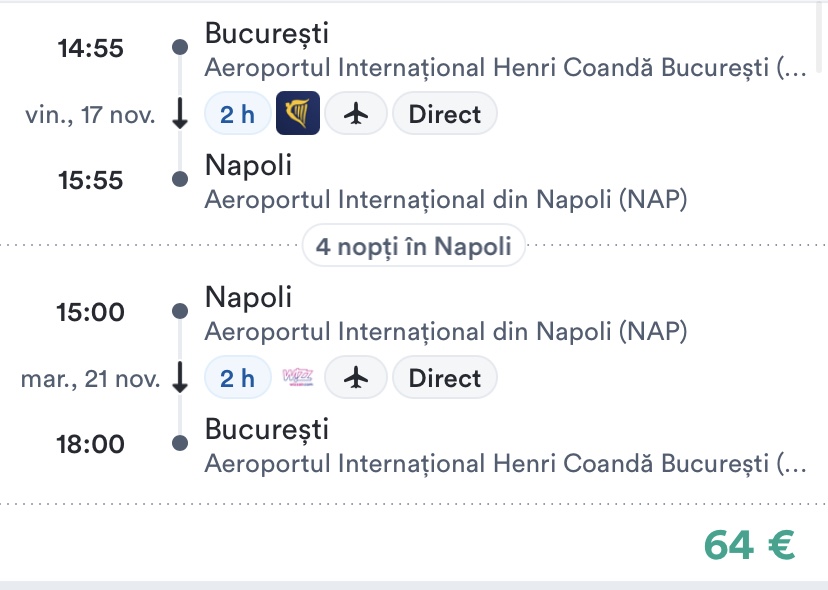 - zbor: Bucuresti – Napoli, 64 euro/pers, dus-intors, toate taxele incluse+bagaj de mana mic