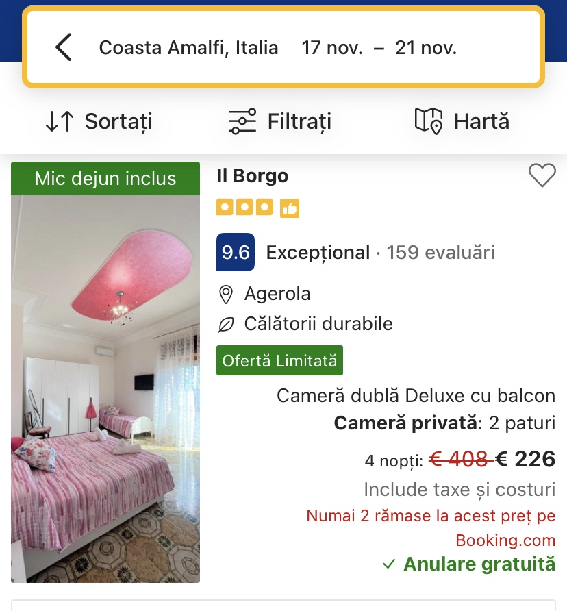 - cazare opt. 1: Il Borgo, 226 euro/camera dubla, 113 euro/pers, mic dejun inclus