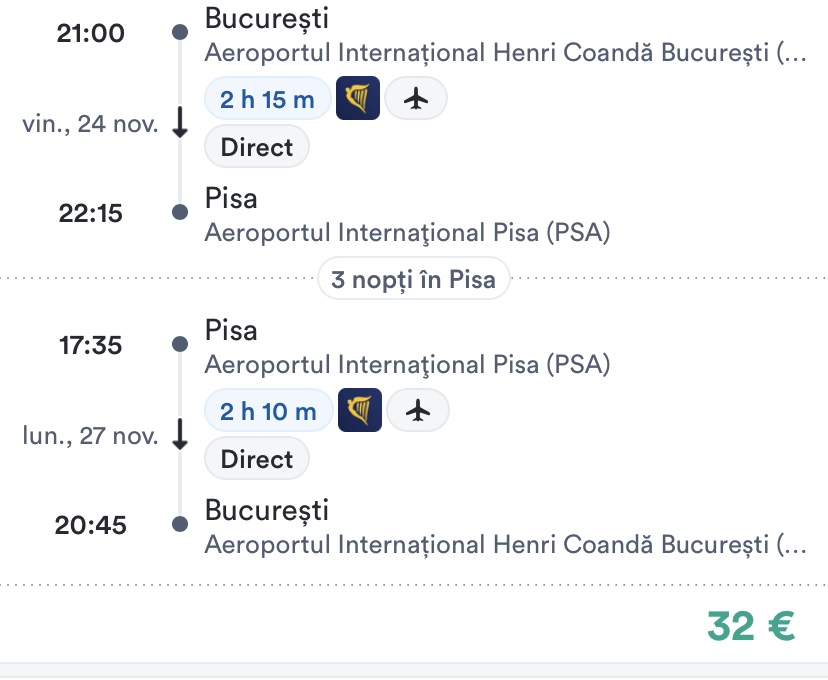 - zbor: Bucuresti – Pisa, 32 euro/pers, dus-intors, toate taxele incluse+bagaj de mana mic