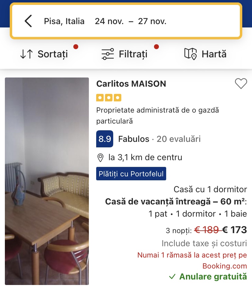 - cazare opt. 1: Carlitos MAISON, 173 euro/apartament, 86.5 euro/pers