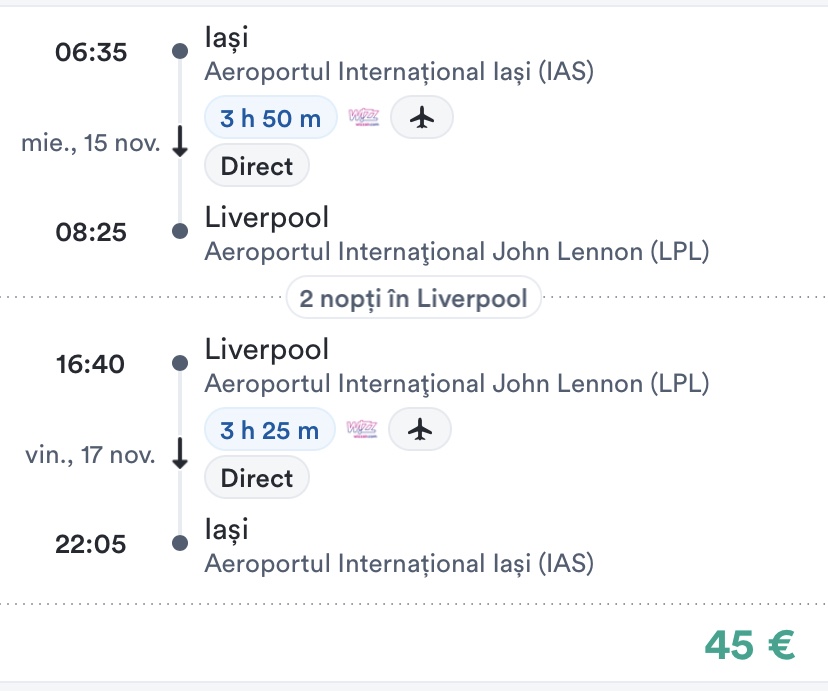 - zbor: Iasi – Liverpool, 45 euro/pers, dus-intors, toate taxele incluse+bagaj de mana mic