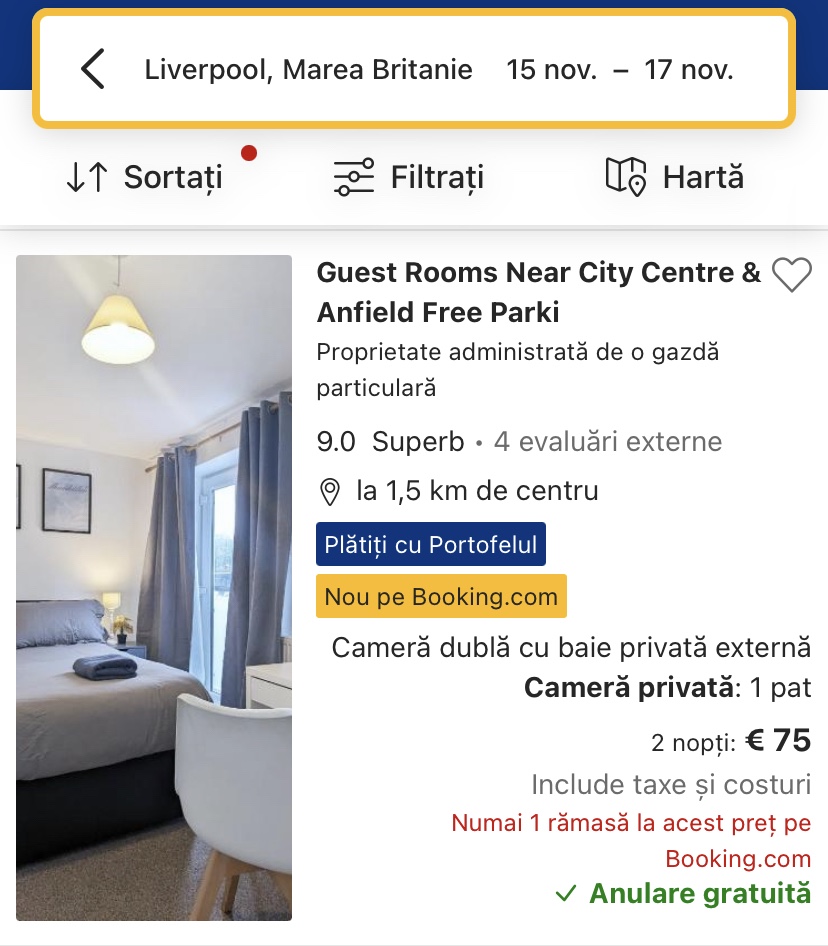 - cazare opt. 1: Guest Rooms Near City Centre & Anfield, 75 euro/camera dubla, 37.5 euro/pers