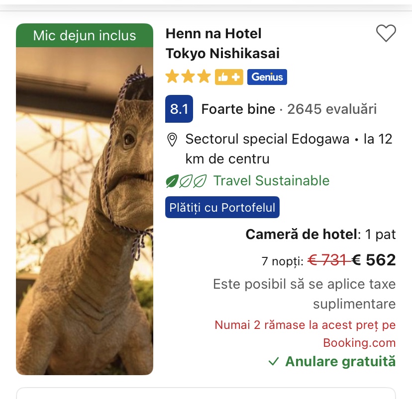 Recomandarea noastra de hotel in Tokyo este: Henn na Hotel Tokyo Nishikasai, are un rating peste 8 si un pret de 40 euro/pers/noapte cu mic dejun inclus. Vezi hotelul aici: