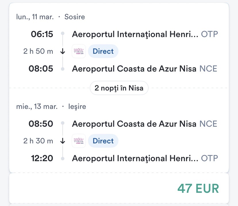 - zbor: Bucuresti – Nisa, 47 euro/pers, dus-intors, toate taxele incluse+bagaj de mana