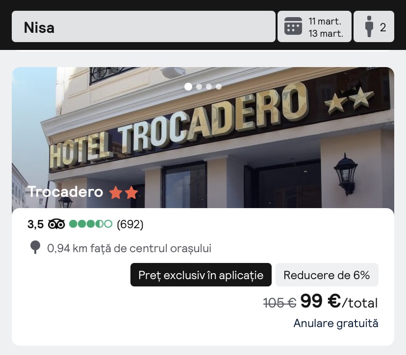 - cazare opt. 1: Hotel Trocadero, 99 euro/camera dubla, 49.5 euro/pers