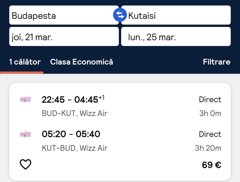 Zboruri ieftine din Budapesta spre Georgia (Kutaisi) la un pret excelent: 69 euro/persoana dus-intors cu toate taxele incluse. Vezi in articol perioade disponibile.