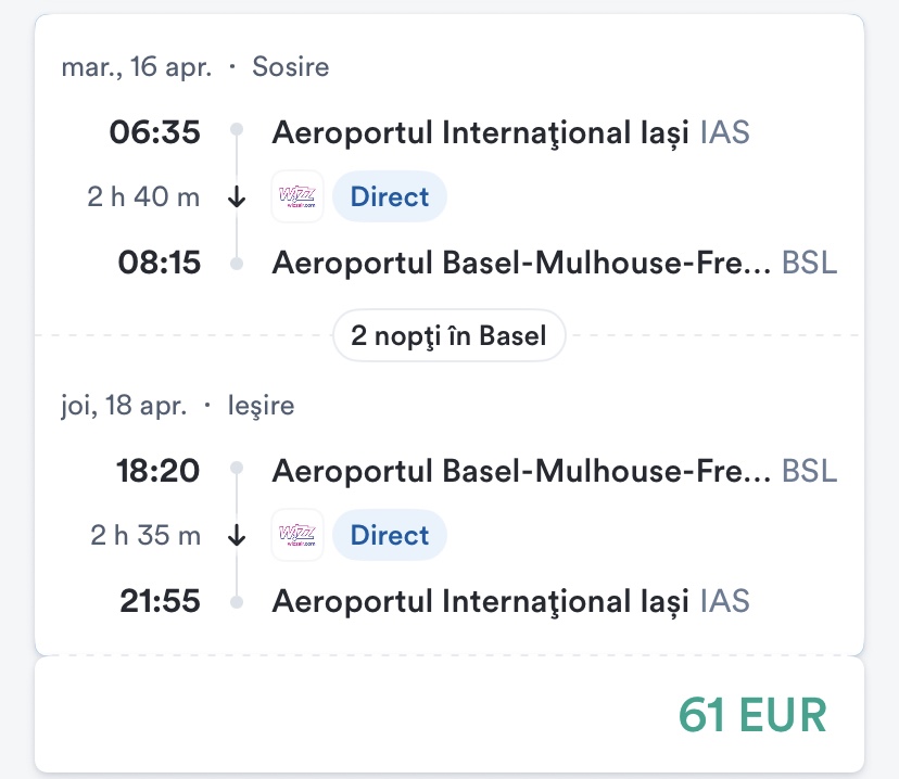 - zbor: Iasi – Basel, 61 euro/pers, dus-intors, toate taxele incluse+bagaj de mana