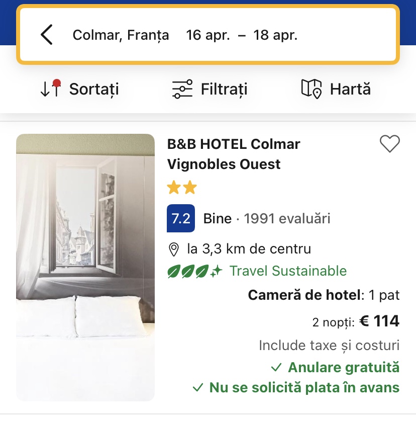 - cazare opt. 1: B&B Hotel Colmar Vignobles Ouest, 114 euro/camera dubla, 57 euro/pers