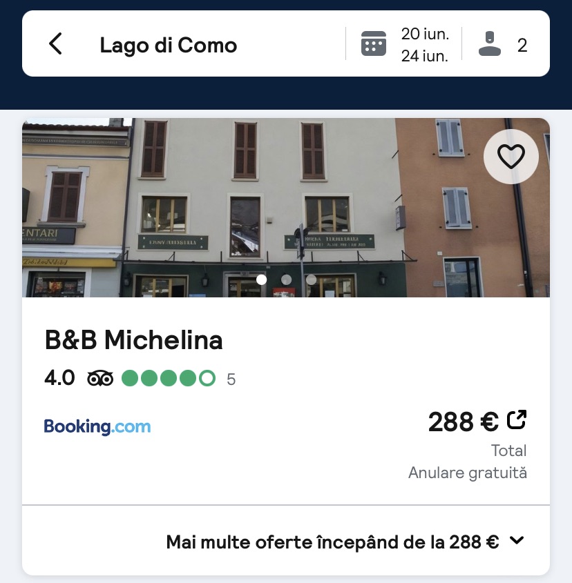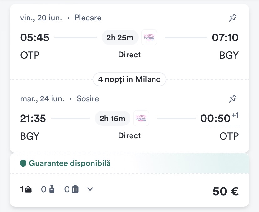 - zbor: București – Milano, 50 euro/pers, dus-întors, toate taxele incluse