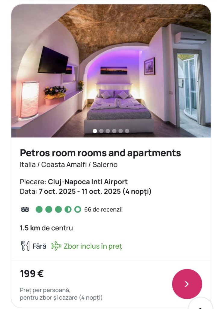 Vacanta pe Coasta Amalfi la un pret si in conditii excelente. Pentru 199 euro/pers ai zbor direct dus-intors si cazare 4 nopti. Zboruri directe disponiile din Cluj si Bucuresti.