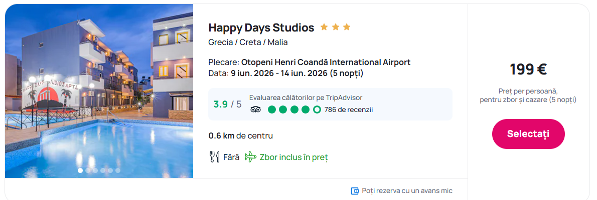 IUNIE 2026! Vacanta in Creta la un pret excelent, 199 euro/persoana. Pretul include zborul direct dus-intors si cazare 5 nopti in hotel foarte bine cotat.