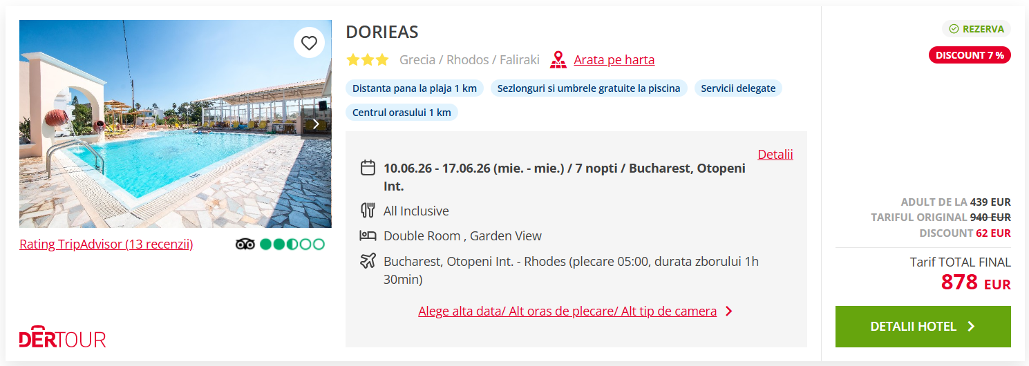 Vacanta All Inclusive in Rhodos la un pret excelent, 439 euro/pers. Pretul include zborul direct dus-intors, transfer si cazare 7 nopti in hotel cu piscina.