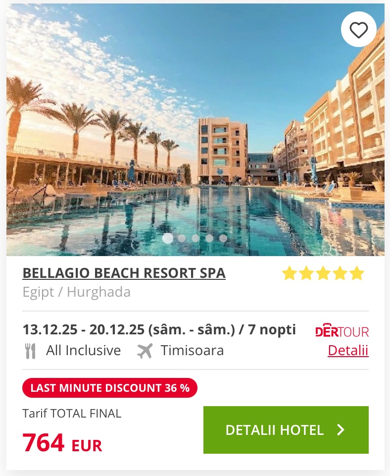 Last minute la 5* în Egipt, Hurghada la 382 euro/persoana. Plecare pe 13 Decembrie, prețul include zborul direct dus-întors, transfer si cazare 7 nopți all inclusive.