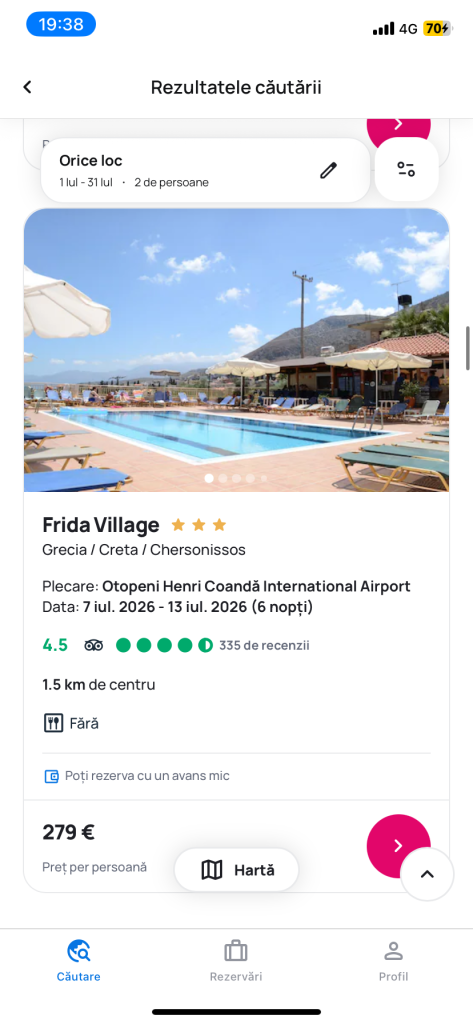 La 279 € / persoană pentru 6 nopți, Creta devine una dintre cele mai accesibile destinații de vară din Europa. Raportul calitate–preț este excelent, iar perioada din iulie este ideală pentru plajă și explorare.