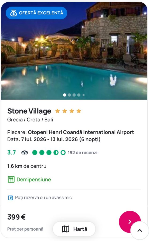 Stone Village Bali este genul de cazare care nu promite lux opulent, ci o experiență autentică în Creta, într-un cadru tradițional și relaxant. Pentru vara 2026, oferta de la 399 € / persoană este una dintre cele mai echilibrate variante pentru cei care vor Grecia fără compromisuri majore.