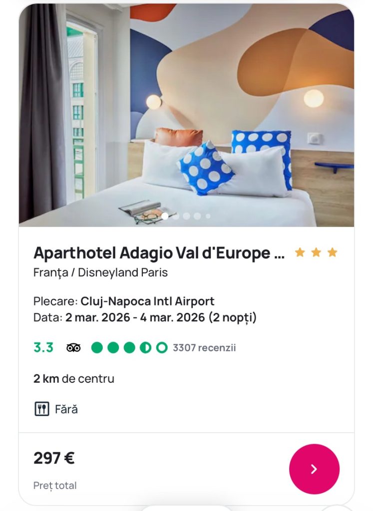 Pentru o destinație precum Disneyland Paris, prețul este foarte competitiv, mai ales pentru o perioadă de început de primăvară.