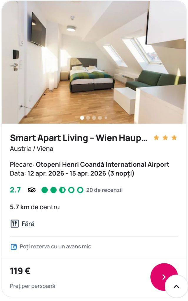 Destinație: Viena, Austria Perioadă: 12 aprilie 2026 – 15 aprilie 2026 Durată: 3 nopți Plecare: Aeroportul Internațional Henri Coandă Cazare: Smart Apart Living – Wien Hauptbahnhof Distanță centru: aproximativ 5.7 km Masă: fără masă