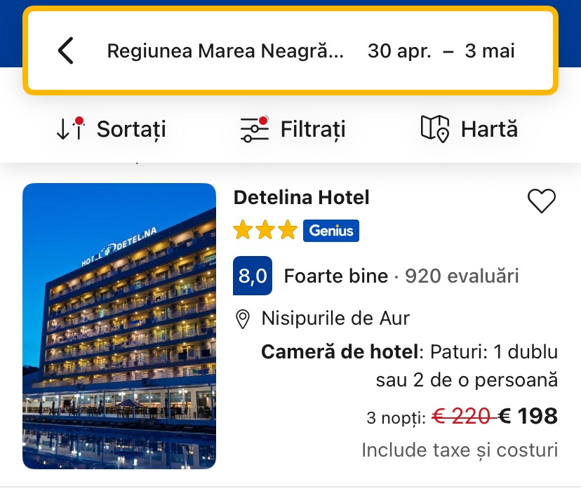 Dacă vrei o vacanță de 1 Mai la mare, această ofertă din Nisipurile de Aur este una dintre cele mai accesibile variante All Inclusive. Pentru 198 € pentru 2 persoane, ai 3 nopți de cazare cu mese și băuturi incluse, perfect pentru un weekend prelungit la Marea Neagră.